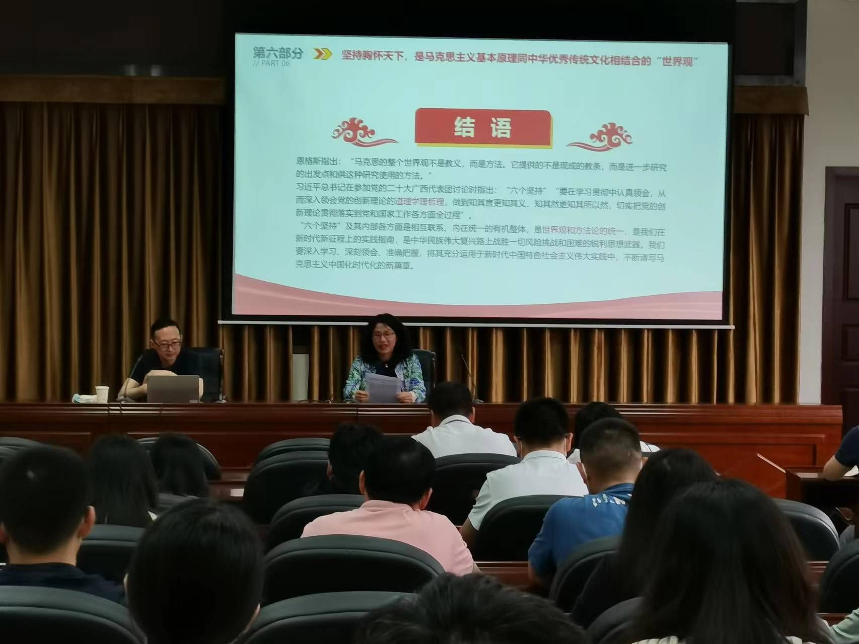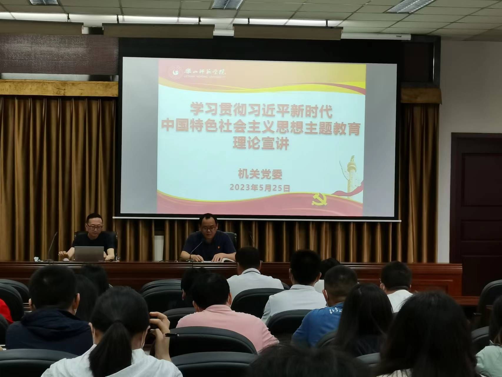 本网讯(文/图 刘艳萍)5月25日,机关党委在弘毅楼312教室开展学习贯彻习近平新时代中国特色社会主义思想主题教育理论宣讲。马克思主义学院副院长赖伟受邀为大家做“学习和把握习近平新时代中国特色社会主义思想的世界观和方法论 ”报告,机关处级领导班子、党员干部120余人参加。