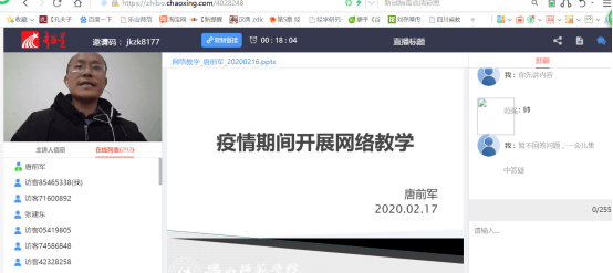 2月17日上午9点,现代教育技术专家、教育学博士唐前军副教授主讲的第二场培训在超星直播平台开播,唐博士以自己在超星平台上讲授的《现代教育技术》课为案例,具体细致的详细讲解了在超星平台如何建课,如何进行线上教学、班级教学组织与管理、作业考核、辅导答疑等内容。