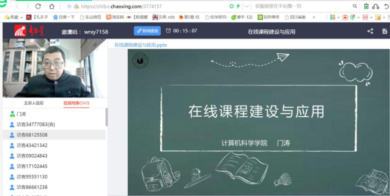 2月15日下午3点,教学部组织的第一场网络培训如期进行。省级精品在线开放课程主讲教师、计算机科学学院门涛教授在超星直播平台进行网络直播讲座,帮助指导我校各任课教师顺利有效地开展网络教学前期准备工作。门教授围绕在线课程建设、网络教学具体实施方法,风趣幽默、深入浅出地帮助指导任课教师如何利用平台开展网络教学。