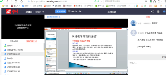 2月17日下午3点,超星公司技术专家李玲老师主讲第三场线上直播培训,李玲老师分别从电脑端和手机端详细演示、讲解了网络课程资源建设、编辑、上传,网络教学过程中的签到、教学组织管理及直播、速课等网络教学方法,手把手地一步一步指导老师具体操作。