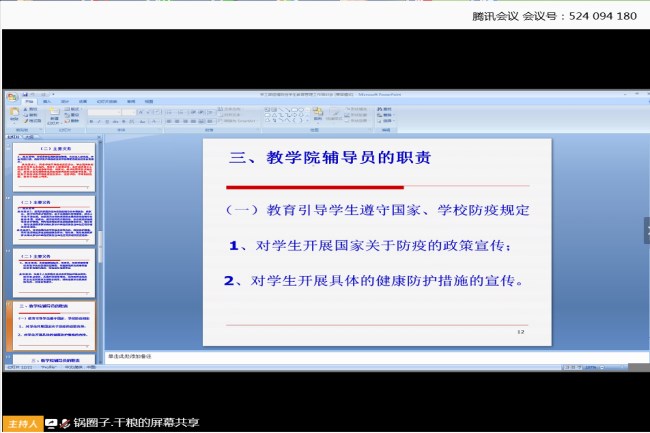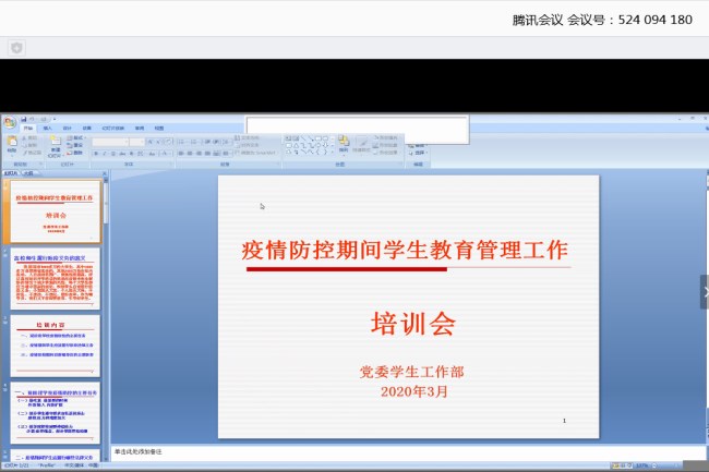 为进一步做好疫情关键时期的防控工作,3月14日晚上7点,党委学生工作部通过网络会议的形式召开了防疫期间学生教育管理工作培训会,全体学工成员参加了培训学习。本次会议由党委学生工作部副部长丁敏娜主持。